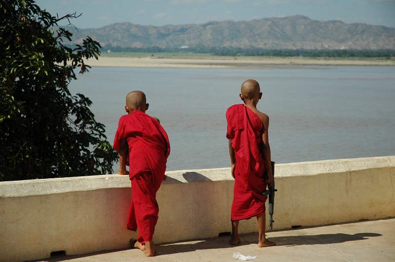 Young monks carrying toy guns.