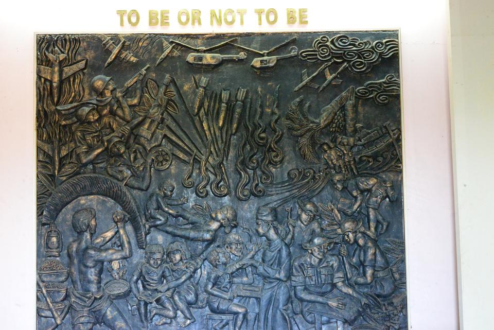 Mural sculpture at the Hanoi Hoa Lo prison.